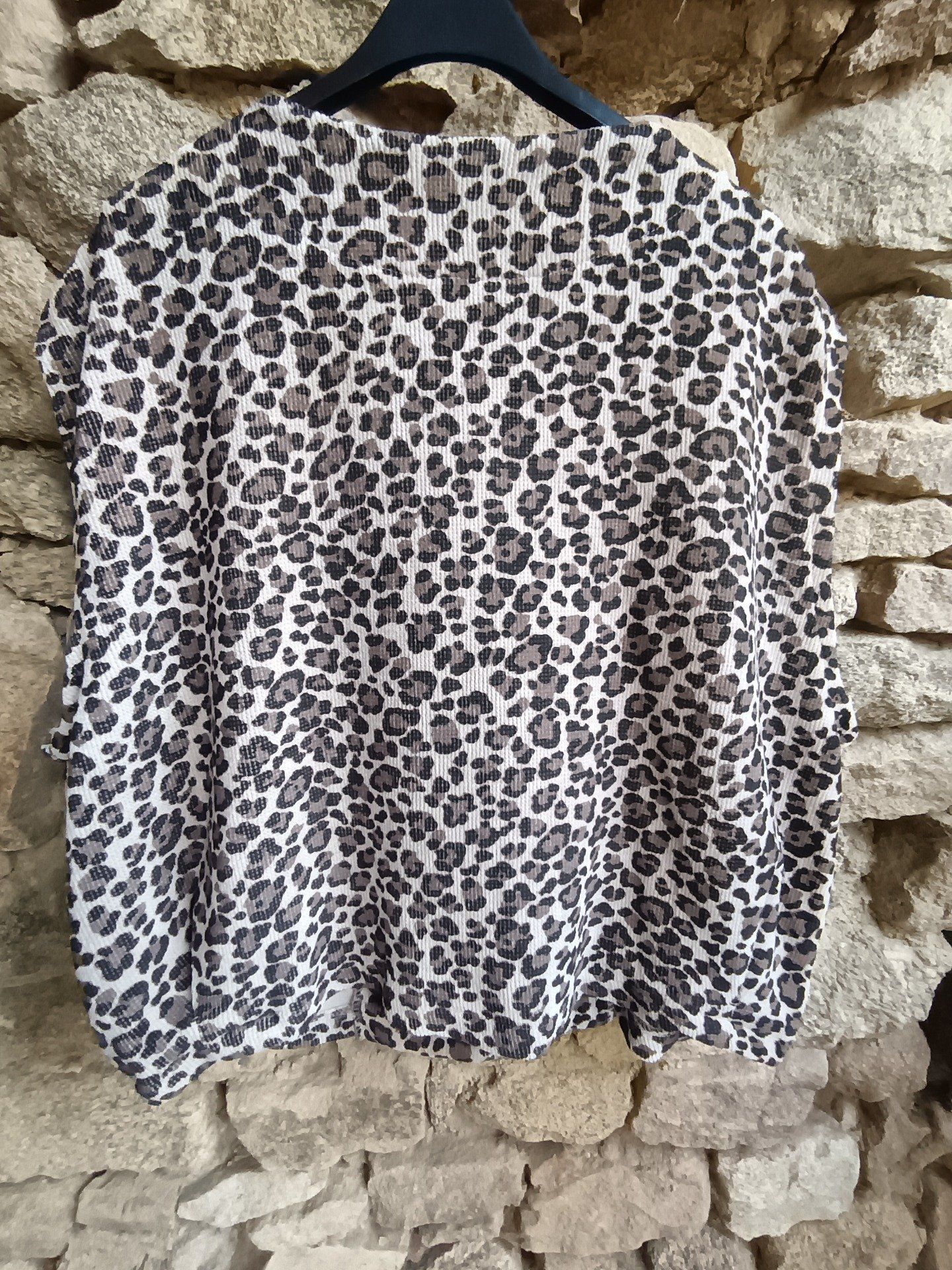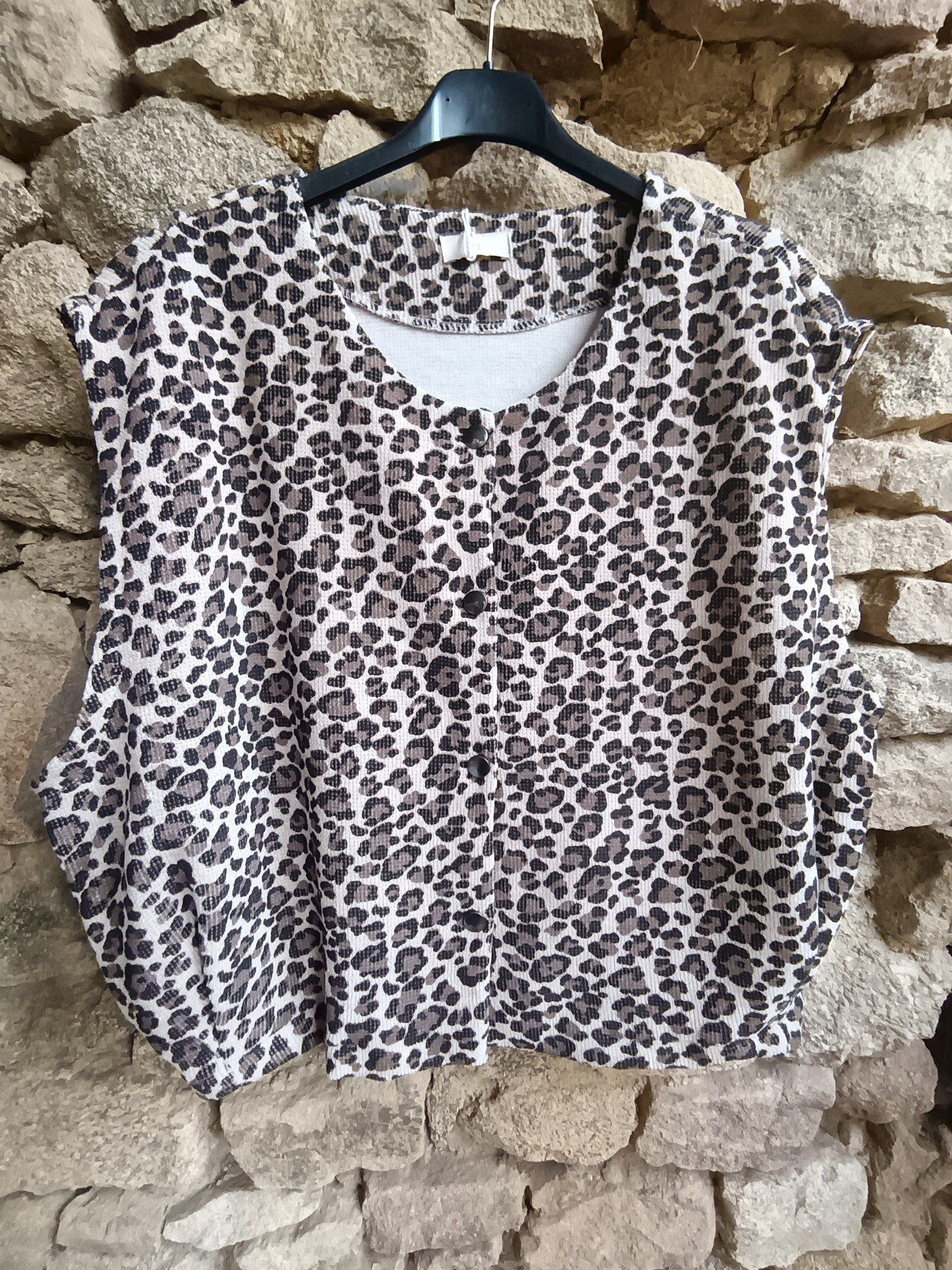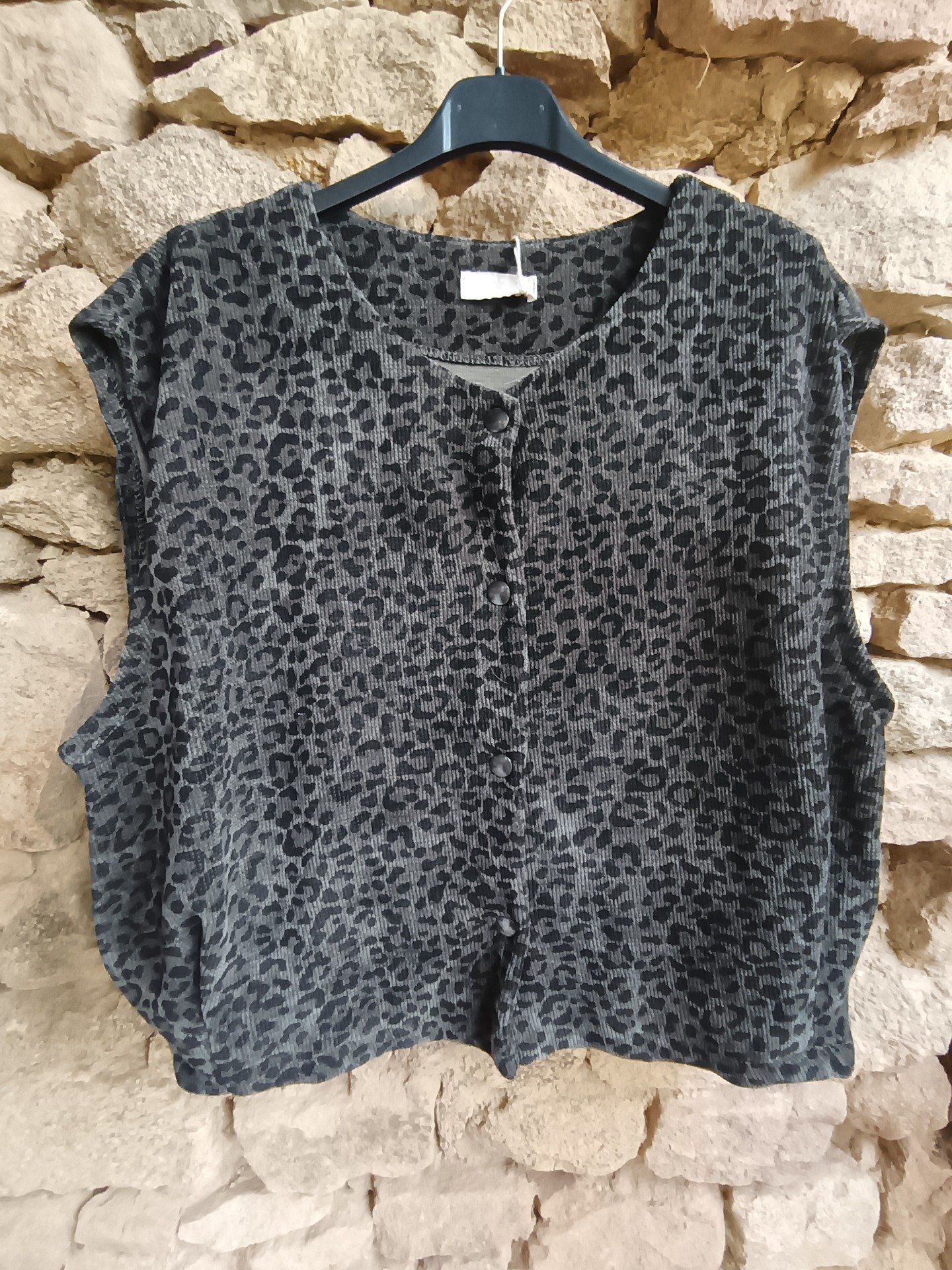 Gilet sans manches en velours imprimé léopard, coupe ballon, boutons pression sur le devant, 2 poches. Look audacieux et tendance rock. Taille unique 36 à 44. Hauteur 53 cm et Largeur sous aisselles de 68 cm. 70% viscose, 25% nylon et 5% élasthanne.