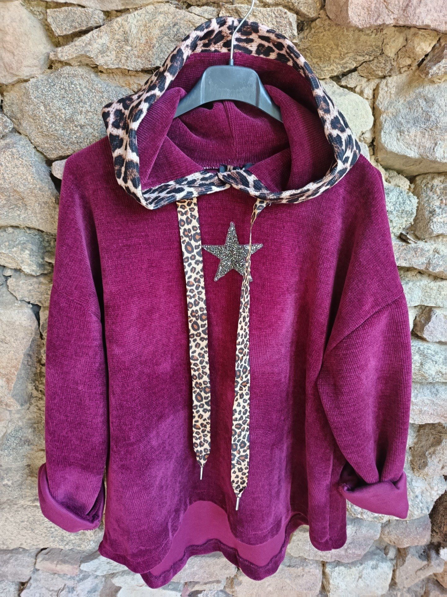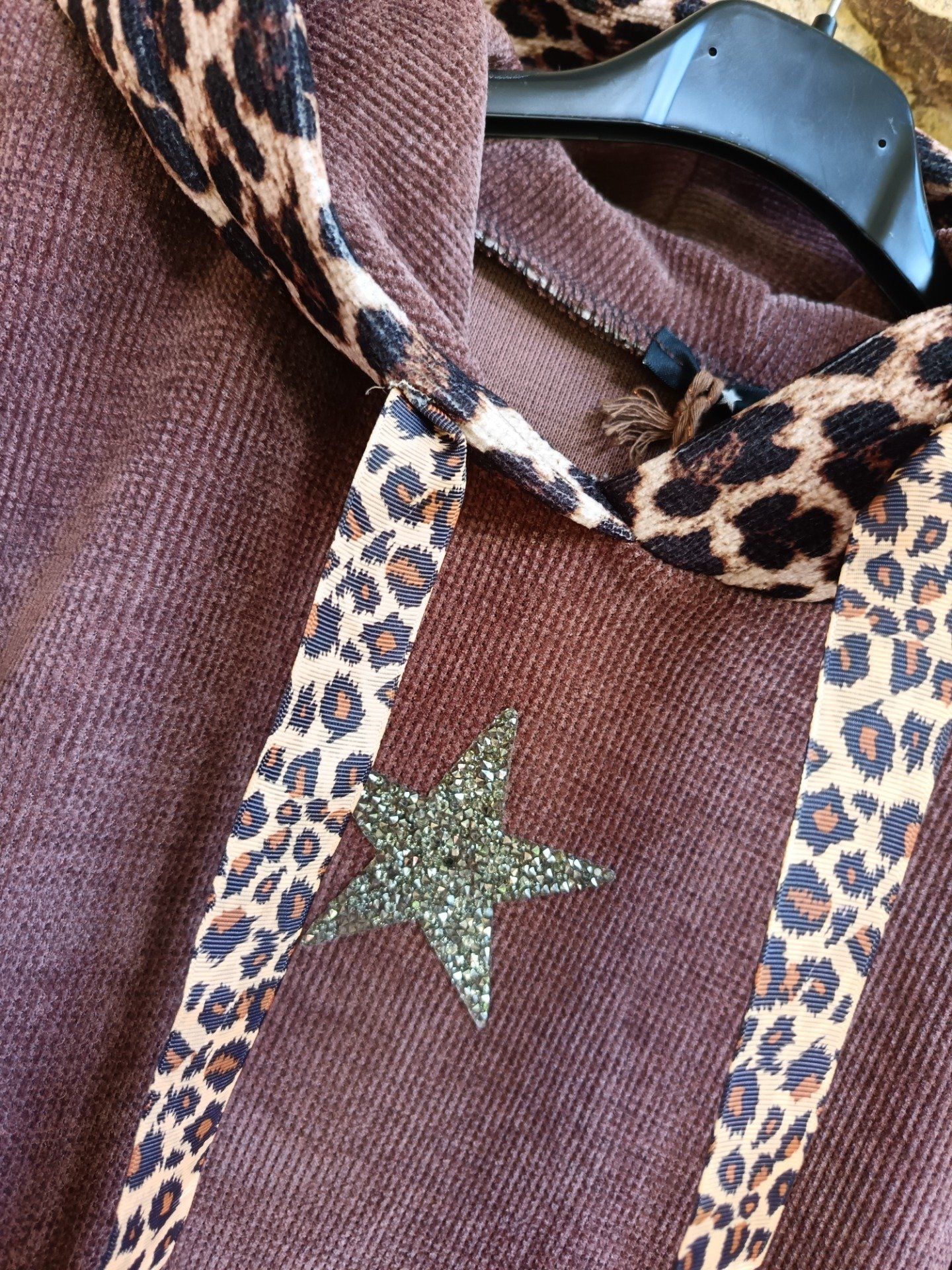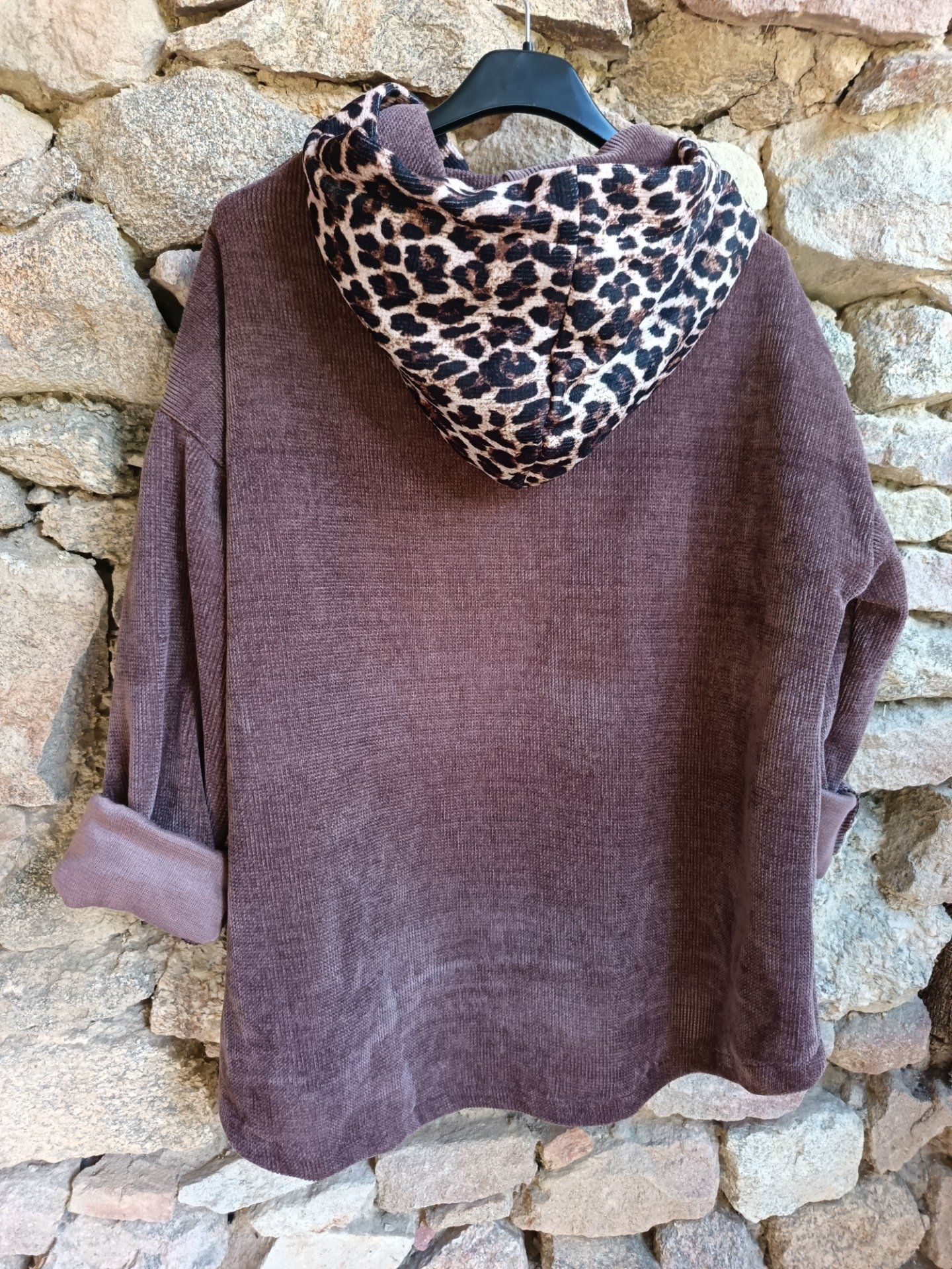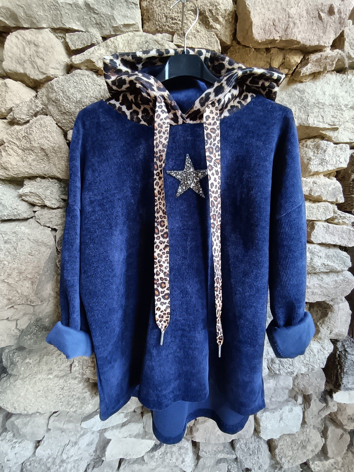 Sweat ample en velours à capuche léopard et cordons assortis. Etoile pailletée sur le devant. Look cocooning et tendance. Coupe asymétrique arrière 66 cm et avant 53 cm. Largeur de 65cm. Taille unique 36 à 42. 95% polyester et 5 % élasthanne.
