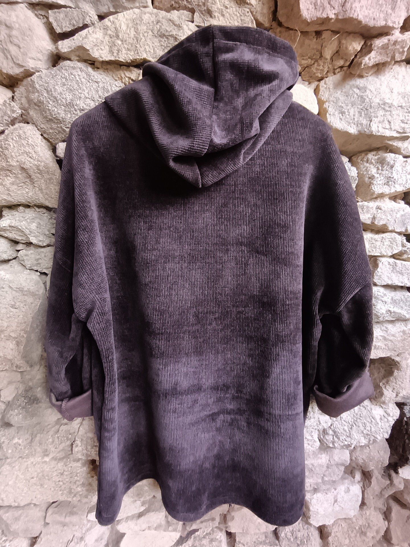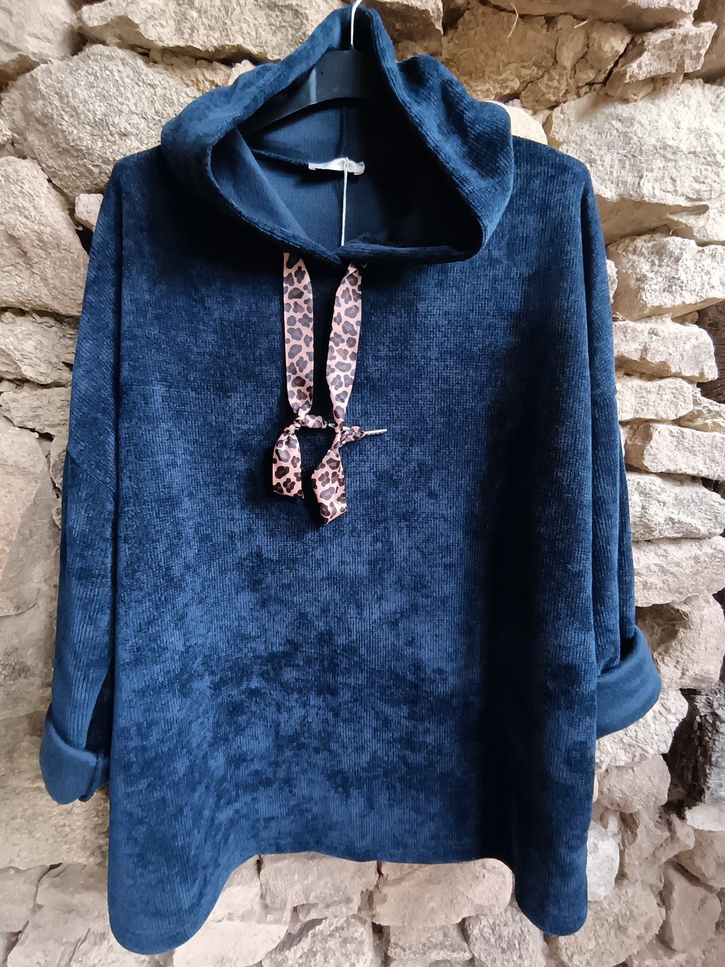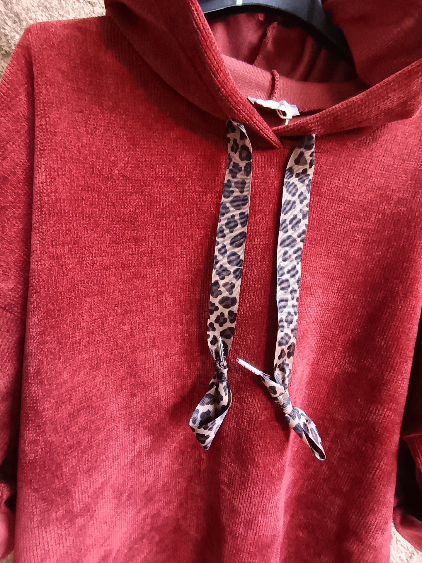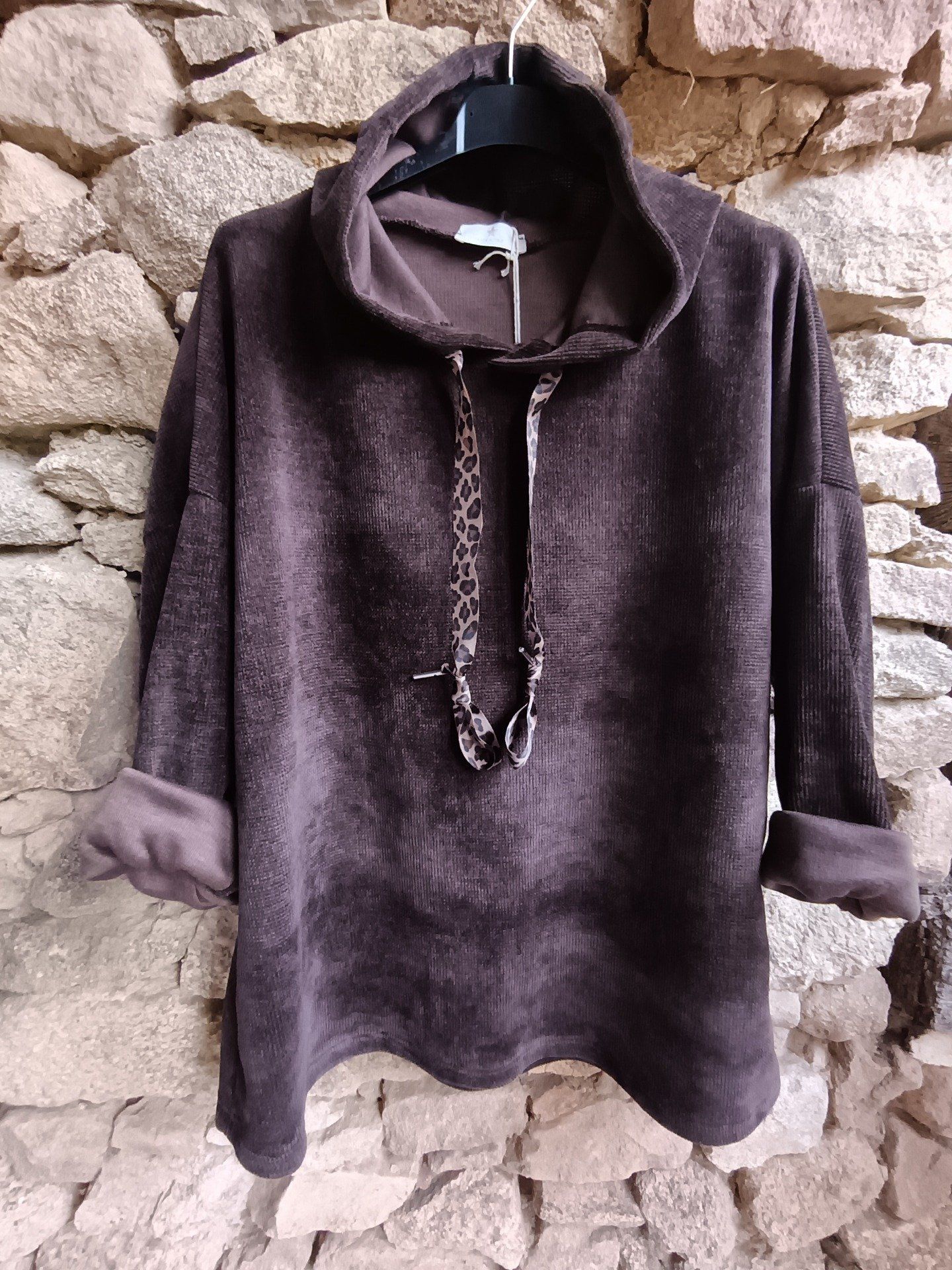 Sweat en velours souple à capuche et à liens contrastants motif léopard. Hauteur 65 cm et Largeur sous aisselles de 70 cm. Taille unique 36 à 42. 70 % viscose, 25 % nylon et 5 % élasthanne.