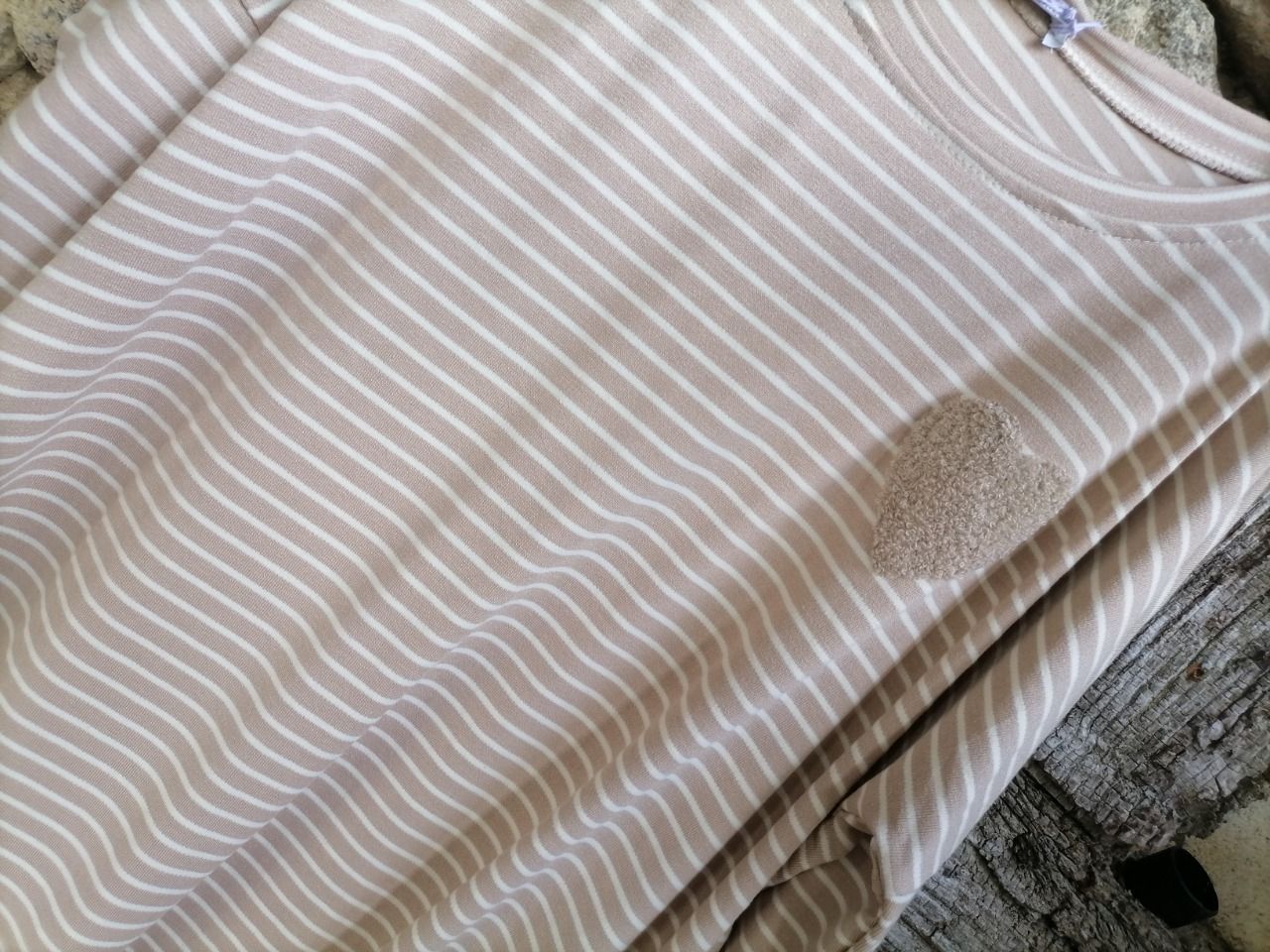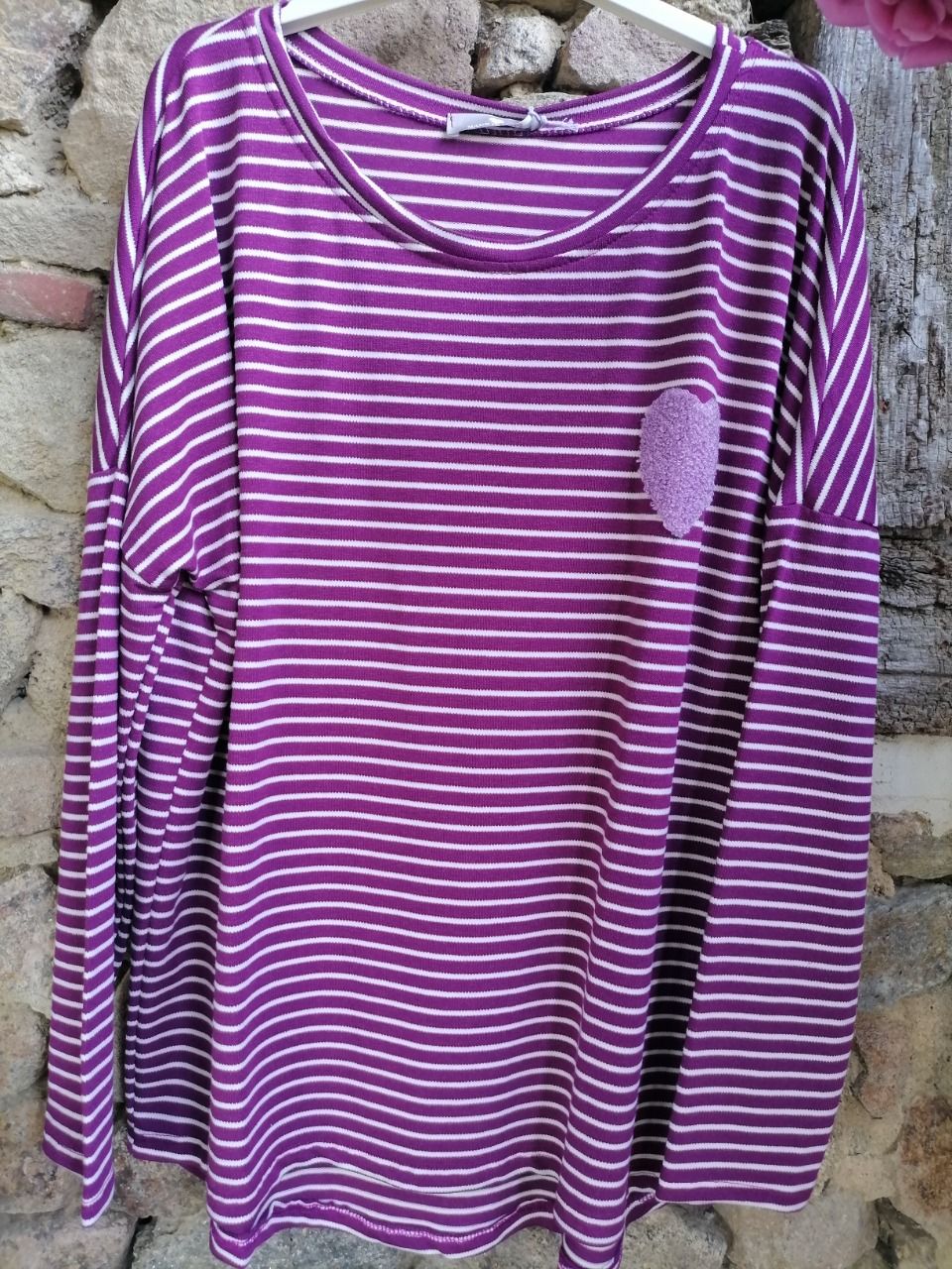 top rayé avec un cœur en éponge ton sur ton. Coupe asymétrique arrondie à l'arrière. Hauteur 57/72 Largeur 70 cm. 50 % coton, 30 % polyester et 15 % viscose.